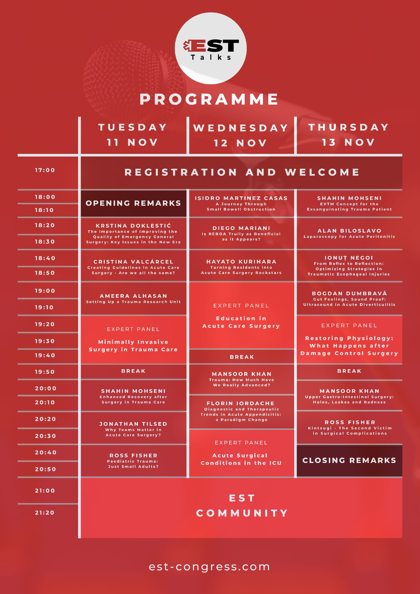 The EST Talks will be held in the evening, between 17:30 and 21:30. They will be divided into 20-minute sections: Expert Talks or Round Tables.